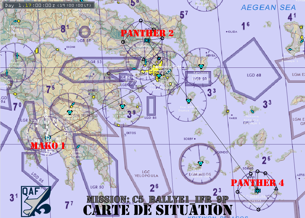 Cette mission est en fait un exercice qui permet à trois escadrilles d'effectuer un parcours nocturne en Grèce en appliquant les notions de navigation aux instruments ainsi que des approches à des bases aériennes en mode IFR (