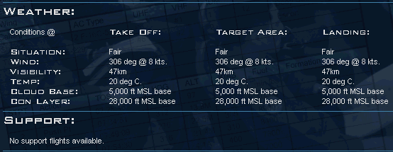 Votre préparation est importante. Le briefing ne couvre pas l'utilisation du HSI, du TACAN ou du mode ILS et nous assumons que vous êtes familier avec nos procédures d'opération standard. Vous devez donc avoir effectué vos préparatifs avant de prendre part à cette mission.
