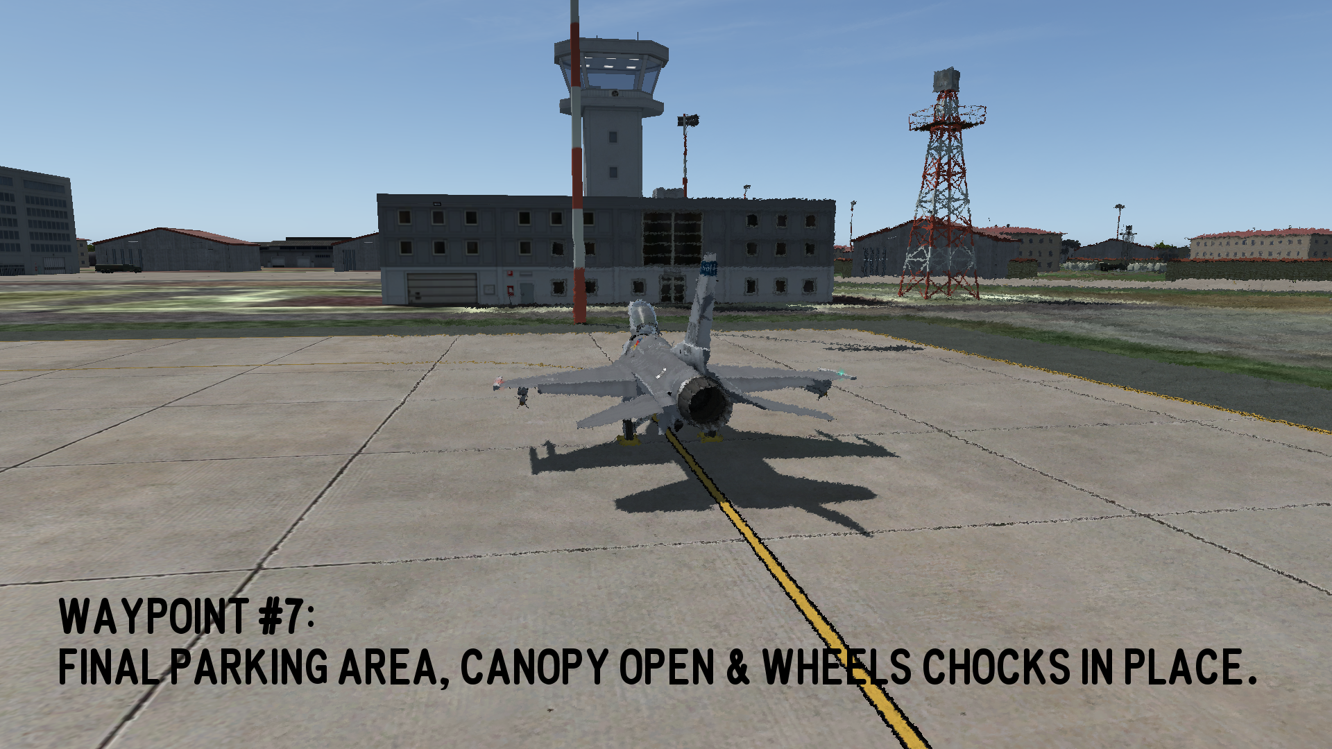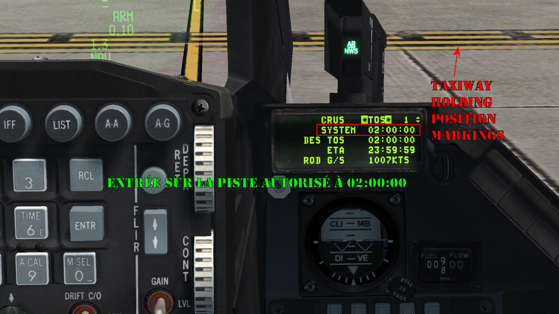 1.03) Votre nez d'avion ou aucune autre pièce de celui-ci ne doit franchir la ligne d'arrêt jaune et noir (TAXIWAY STOP LINE MARKINGS) et ce jusqu'à l'heure système 02:00:00 ZULU. Pour voir l'heure système, on doit appuyer sur le bouton ICP 5 (CRUS) de votre avion. Vérifiez le «SYSTEM TIME» sur le DED. Attendre l'heure de décollage (02:00:00) avant de franchir la ligne d'arrêt du taxiway, même si la tour de contrôle vous autorise à entrer en piste avant 02:00:00.