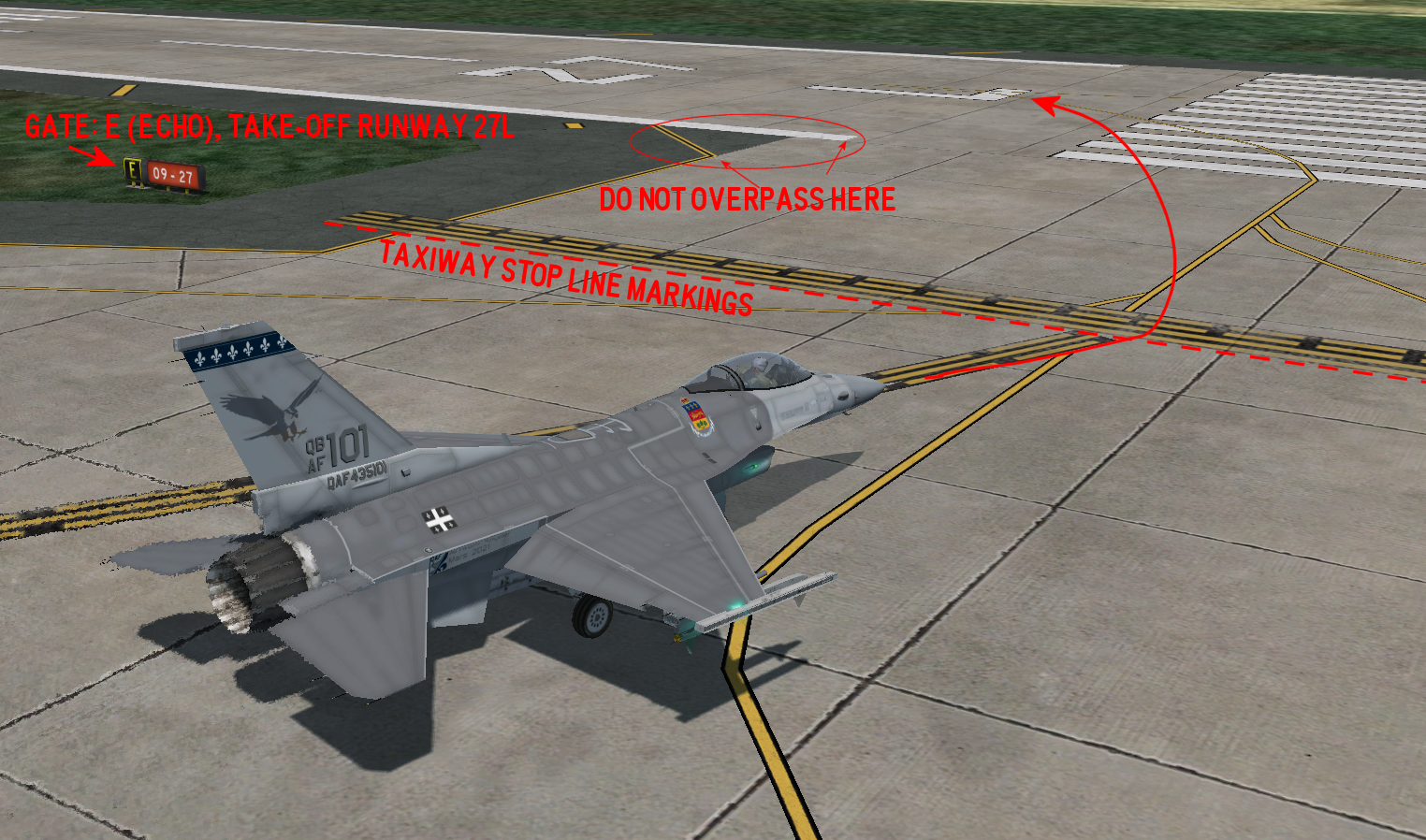1.02) On doit avancer son avion (Taxi) avant la ligne d'arrêt du taxiway vers le début de la piste 27L (Gate E).