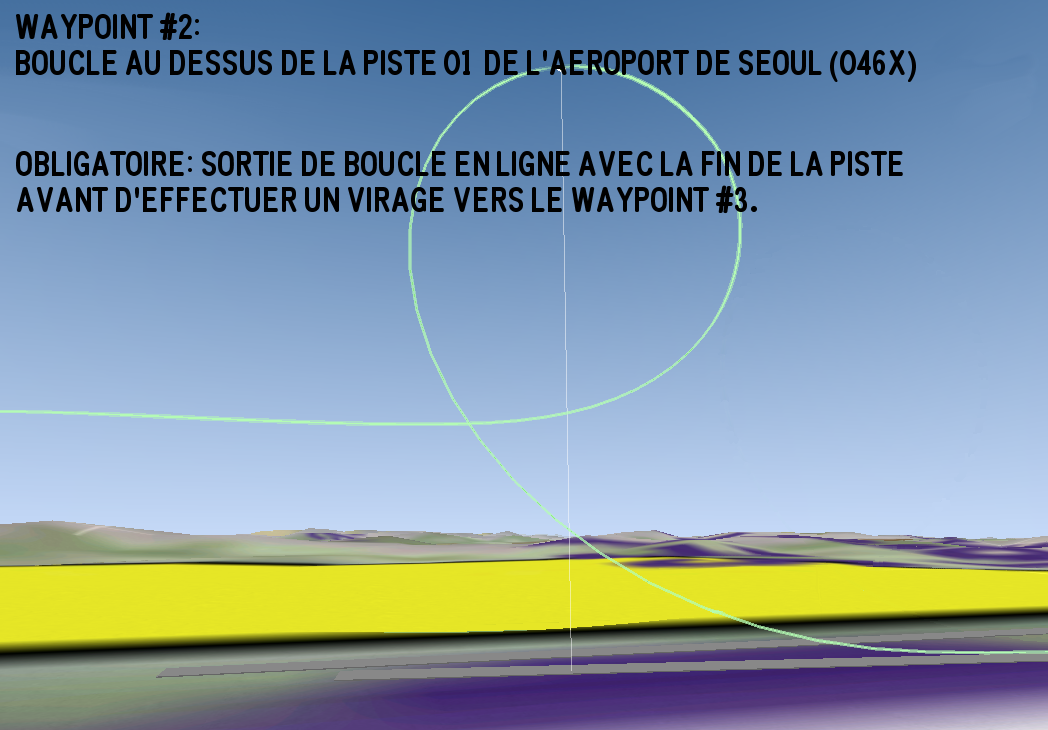 2.03) On doit effectuer sa sortie de boucle en se dirigeant vers l'extrémité de la fin de la piste 01 et en ayant ses ailes en position horizontale (level) avec le sol avant d'amorcer la suite du parcours vers le waypoint #3.