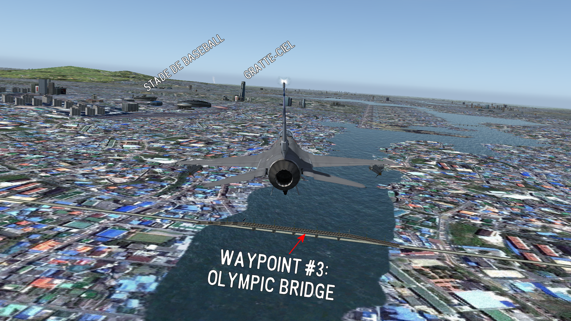 3.01) On doit absolument passer au dessus du pont «Olympic Bridge» du waypoint#3 de manière précise (Un alignement avec le mode autopilot «strng» vers le point de navigation #3 est fortement suggéré ici.).
