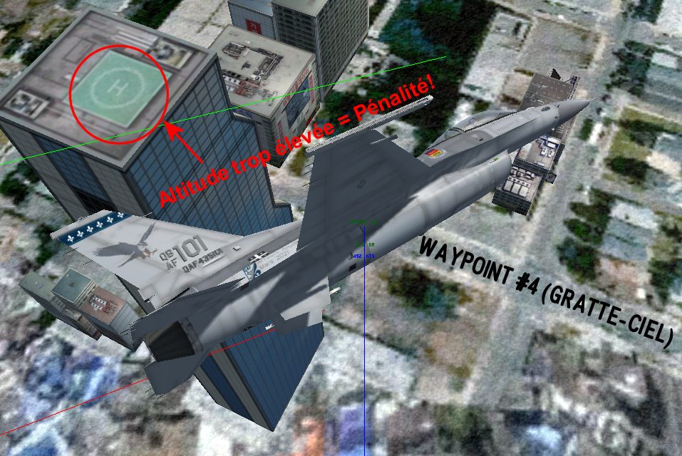 4.04) Le pilote du F-16 sur cette photo de gauche qui contourne le gratte-ciel seraît pénalisé de 30 secondes à son temps de chronométrage pour avoir contourné le gratte-ciel à une altitude supérieure à celle du toît de l'immeuble.