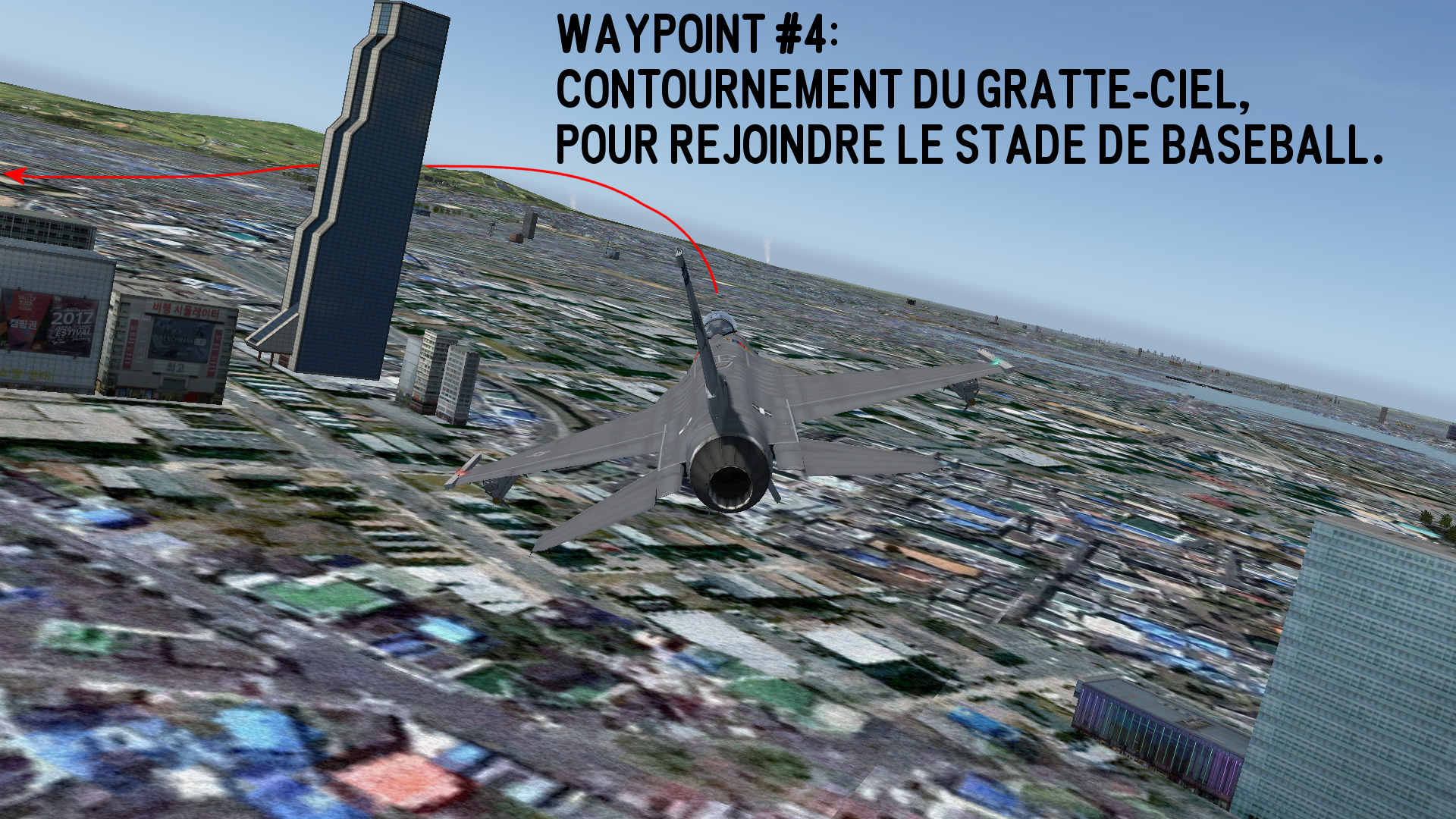Vous devez également attendre que votre «Flight Path Marker» se renverse totalement à 180° avant d'amorcer votre prochain virage vers le gratte-ciel situé près du waypoint #4. Un avion qui ne sera pas à l'horizontal (Level) avec le sol au dessus du waypoint en vue satellite, sera pénalisé de 30 secondes.