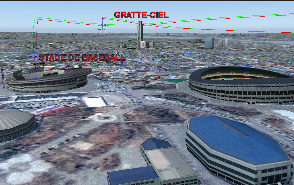 4.06) Attention, il y a un stade de baseball mais aussi un stade de soccer (foot). Le plus petit des deux est le stade de baseball et c'est celui-ci qui doit-être survolé de manière très précise.