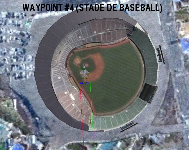 4.05) Votre avion doit ensuite se diriger vers le stade de baseball afin de passer exactement au dessus. Une vue satellite (max zoom) de l'ACMI doit permettre de voir entièrement le terrain de balle situé à l'intérieur du stade.