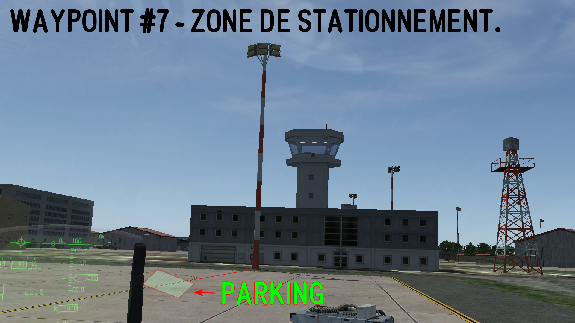 7.05) Vous devez vous stationner, aligné droit devant et le plus près possible du lampadaire (poteau rouge et blanc) situé devant la tour de contrôle.
