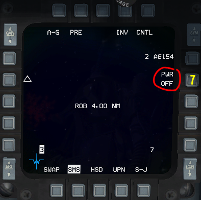 Via le SMS, activer le «Power» à ON via l'OSB#7 pour initialiser les référenciels des emports des missiles JSOW.
