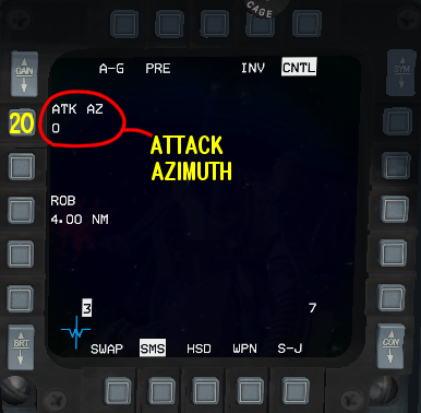 On peut modifier ce paramètre via la fonction ATK AZ (ATTACK AZIMUTH) en cliquant l'OSB#20 avant le larguage de la JSOW de l'emport concerné.