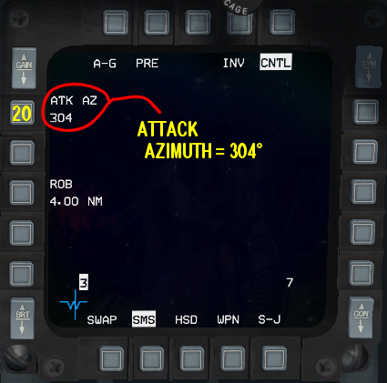 On doit cliquer sur les chiffre via les différents OSB pour effectuer la composition du degré azimuth souhaité. Ici, on clique les OSB pour chaque chiffre, soit 3, 0, 4 puis ENTR qui nous permet de modifier l'ATK AZ à 304°.