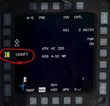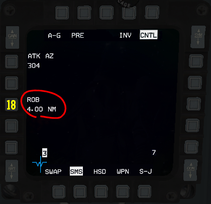 On peut modifier le paramètre du RANGE ON BEARING (ROB) via l'OSB#18 pour inscrire à quelle distance (en miles nautiques) le JSOW va amorcer son virage pour s'orienter vers son azimuth d'attaque.