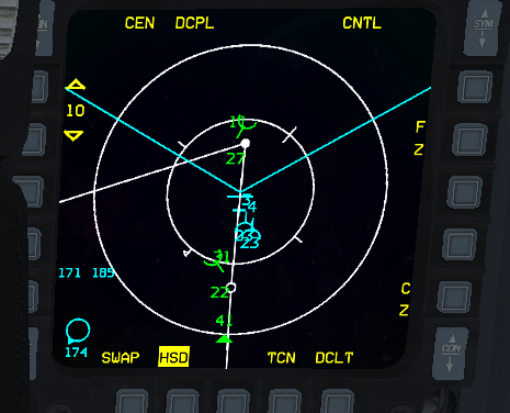 Ainsi le HSD et votre FCR vous afficheront où se trouvent les commandants de chaque flight en vue vol d'oiseau sur vos écrans MFD, si ces derniers synthonisent la fréquence tactique (UHF Preset #6).