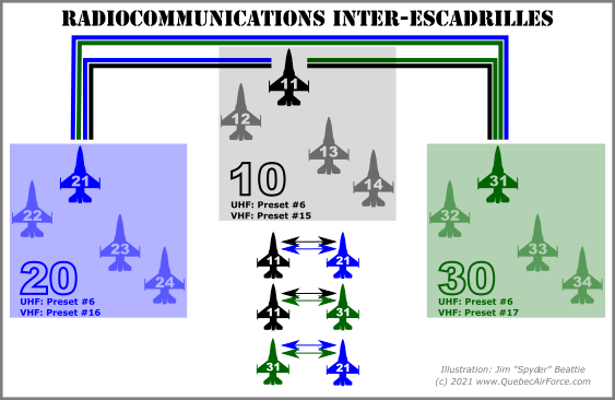Les membres d'une escadrille doivent synthoniser la fréquence VHF avec le «Preset» associé à leur IDM. (Exemple: Escadrille #10 = Preset VHF #15, Escadrille #20 = Preset VHF #16, Escadrille #30 = Preset VHF #17).