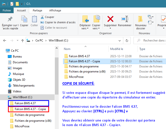 Il est fortement suggéré d'effectuer préalablement une copie de votre simulateur [C:]\Falcon BMS 4.37 vers «[C:]\Falcon BMS 4.37 - Copie» afin de conserver une copie fraîche de votre simulateur qui était fonctionnel avant d'installer ce théâtre!