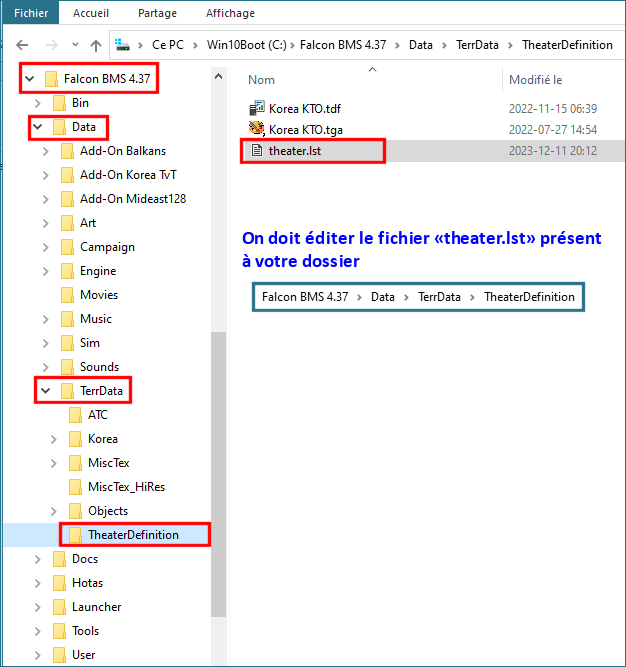 Vérifiez visuellement qu'il n'y a qu'un seul fichier «theater.lst» présent dans votre dossier TheaterDefinition et que vous n'avez pas ajouté par erreur un nouveau document avec le nom suivant theater.lst.txt car le simulateur «Falcon BMS» ne lira jamais ce fichier et votre théâtre n'apparaîtra jamais dans le simulateur ou dans notre application 101-VersionOfficielle437.