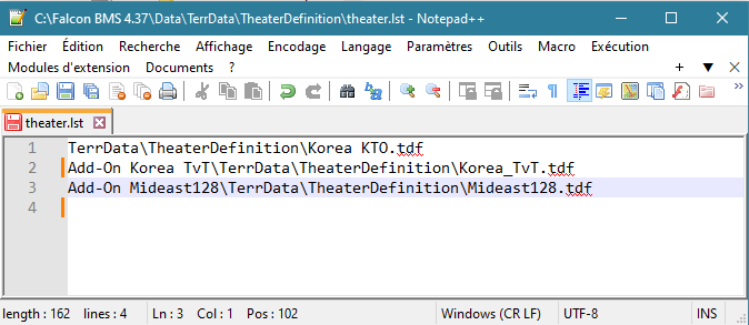 theater.lst afin de retirer la ligne suivante «Add-On Mideast128\TerrData\TheaterDefinition\Mideast128.tdf» uniquement.Sauvegardez ensuite ce fichier avec prenant bien soin de conserver le nom «theater» et l'extension «.lst».